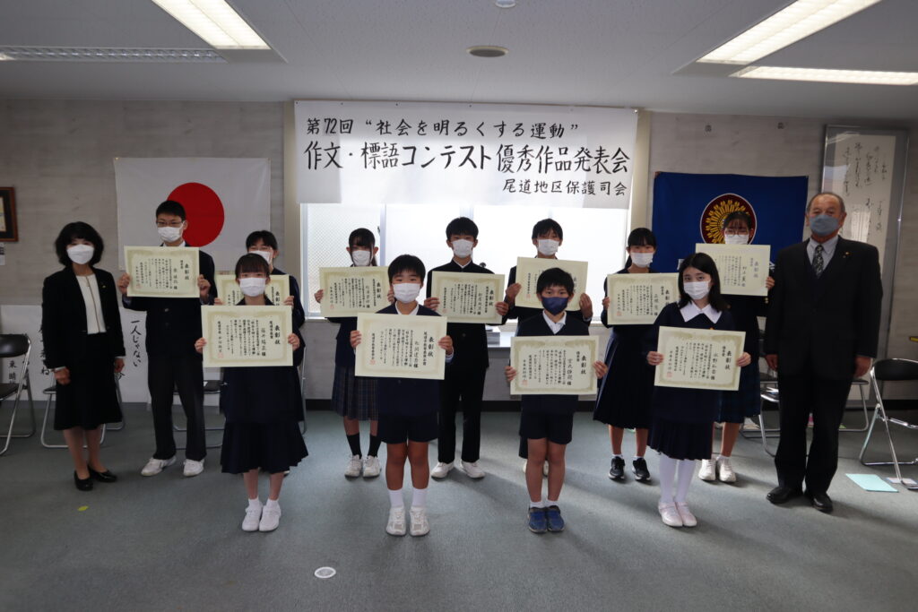 今回のコンテストには、尾道市内の小・中学校から1191点の作文と、279点の標語というたくさんの応募がありました。次世代を担う小・中学生が、犯罪のない明るい社会づくりについて、考えてくださったことに大きな意義があると思います。