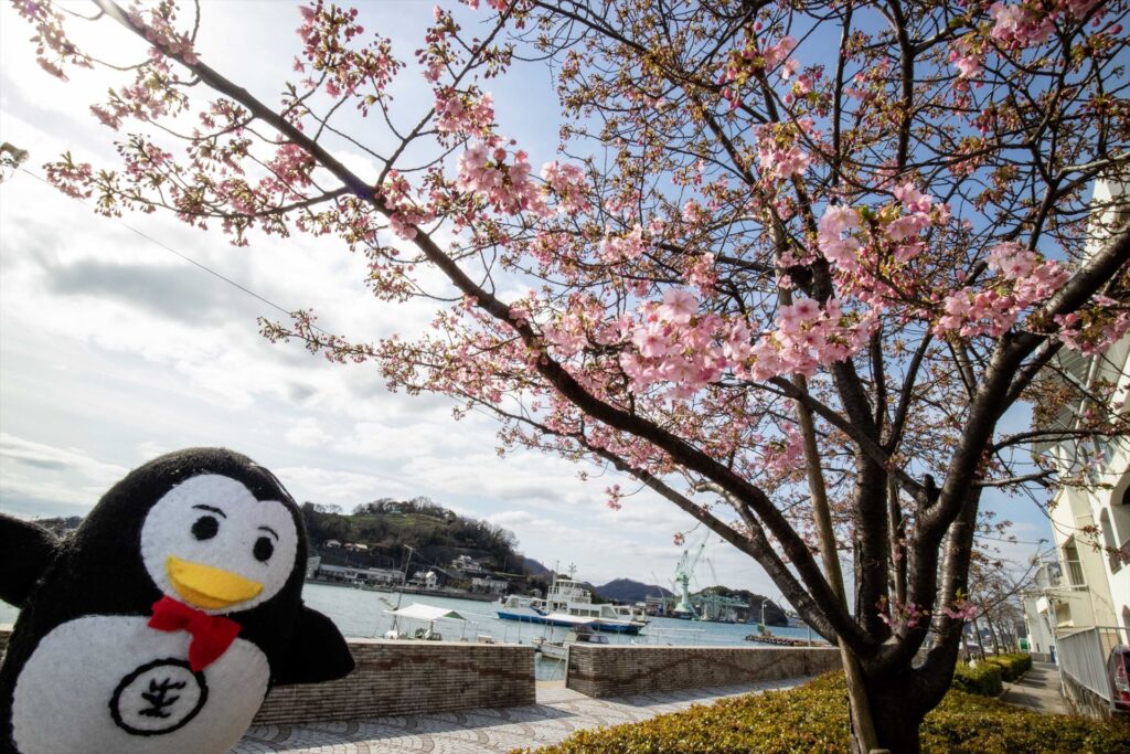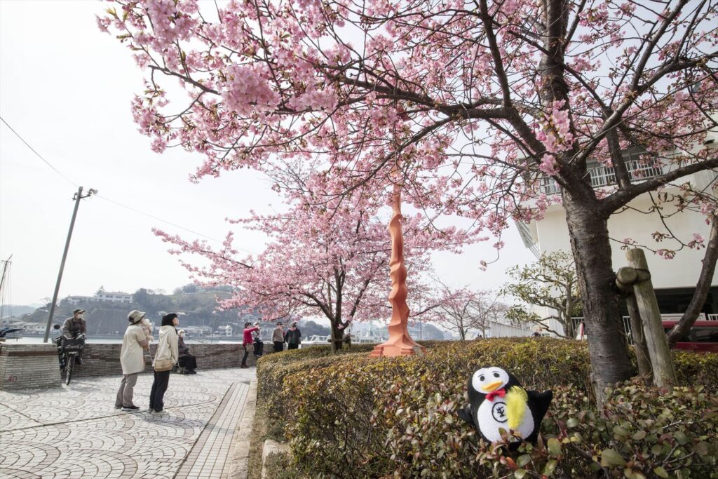 尾道港湾緑地広場の桜の木です。ライトアップされ、駅前の公園が華やかです。